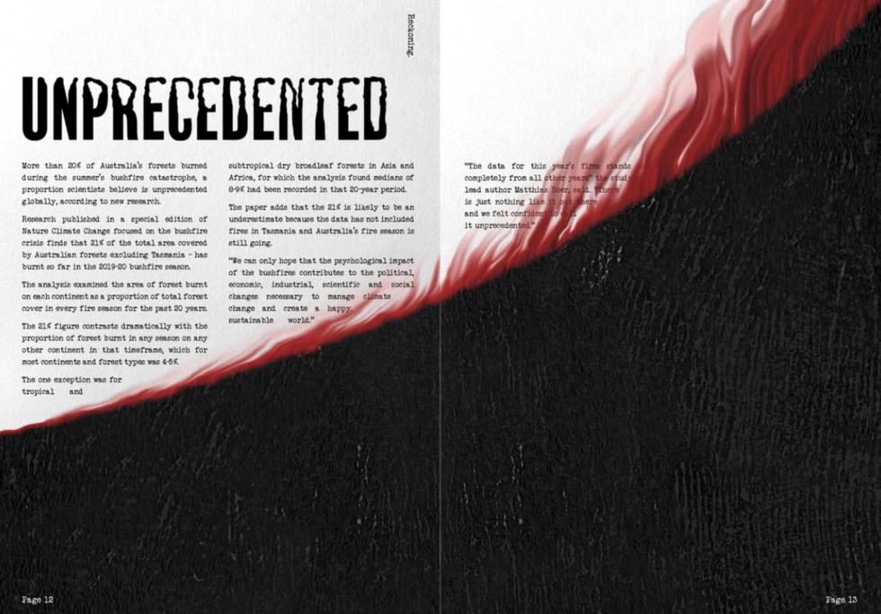 In response to the UNSW Grand Challenge on Climate Change, I developed a dynamic visual narrative for an experimental postcard series. Typographically driven, the story focuses on the idea that our Earth is a responsive force, warning us that the devastation we inflict is not passively received, but instead has dire consequences. For the reckoning unleashed through natural disasters, is not an uncontrollable cry of anger, but one of Mother nature's many warnings.